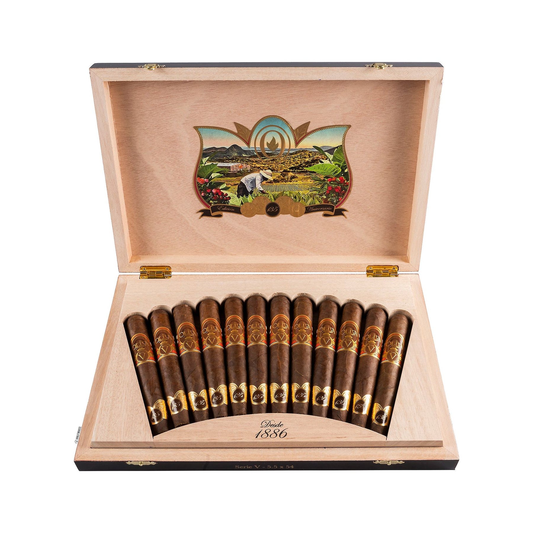 These commemorative cigars measure 5 1/2 x 54 and are presented in an eye-catching 12 count box with a fanned out display. Like the rest of the Olive Serie V range, these cigars are made in Nicaragua at the Tabolisa factory and are the same complex blend of Nicaraguan long filler tobaccos, blended with fermented Jalapa Valley Ligero and finished with a high priming Sun Grown wrapper.